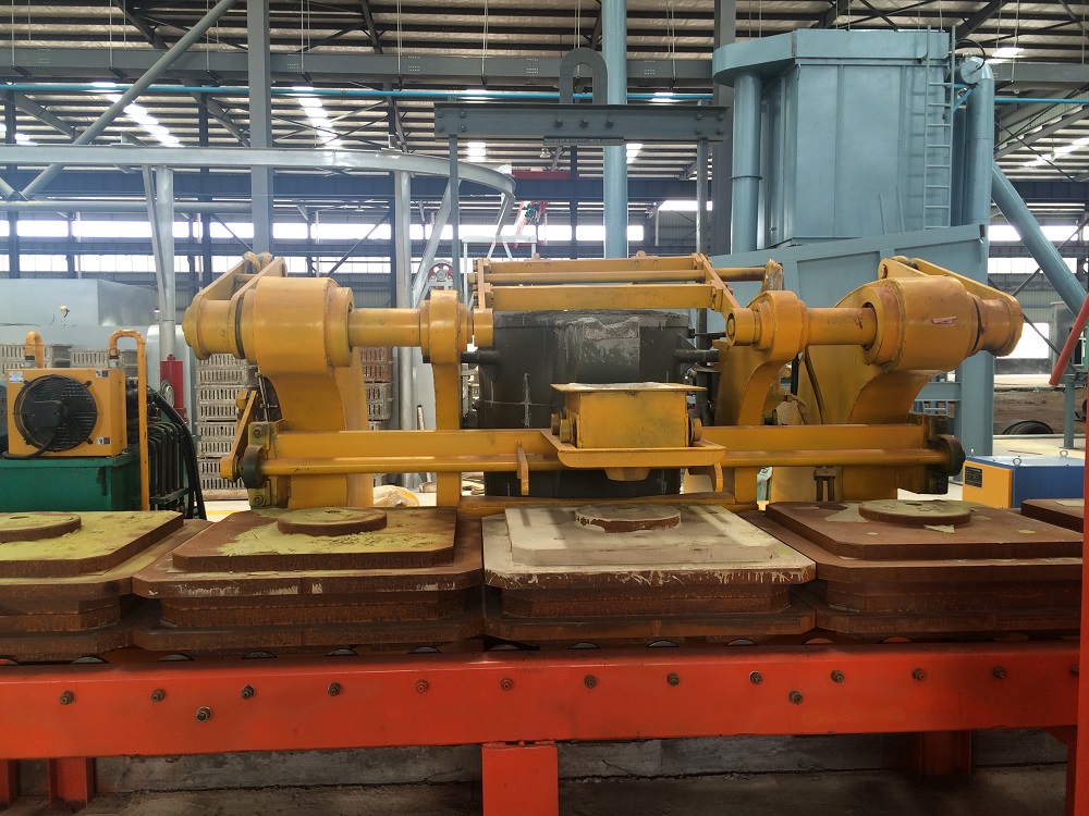通過搖桿開關(guān)將包蓋往上掀起,通過送包小車將澆包放置底座退出澆注機(jī),將裝滿鐵水的澆包平穩(wěn)放在底座上,確定澆包放穩(wěn)并且位置無偏移后拉動(dòng)送包小車的搖桿開關(guān),將澆包送入澆注機(jī)內(nèi)。待澆包到位后蓋上包蓋,將澆注的緩沖嘴對(duì)準(zhǔn)砂箱的澆注口即可開始澆注。